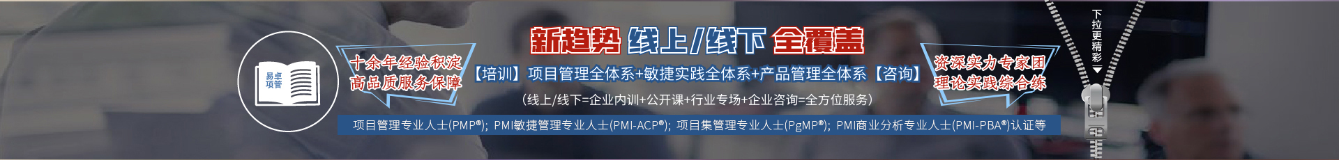 上海易卓公司[易卓智庫],憑借項目化管理專業品牌優勢,經過多年積淀,不僅打造了一支精英運營團隊,更是整合塑 造了涵蓋項目管理、項目化管理、PMP?、PMI-ACP?、PgMP?系列認證和贏在職場系列的培訓咨詢導師教練專家團隊, 從而形成了上海易卓公司業務平臺可持續發展的專業智庫,繼而奠定了易卓所在行業的踐行者服務品牌地位!
