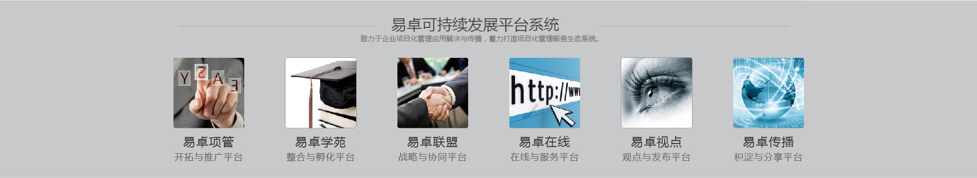 上海易卓公司本著專注、創新、整合、共贏、可持續發展的經營理念,傾力打造并致力于解決企業和職場人士對項目管 理、項目化管理、PMP?系列認證和贏在職場修煉的學習、分享、交友、發展、提升等方面的公益訴求。易卓多年的誠 摯服務經驗積累和眾多知名企業及職場人士的大力支持,共同鑄就這一增值服務與共享共贏的互動社區。